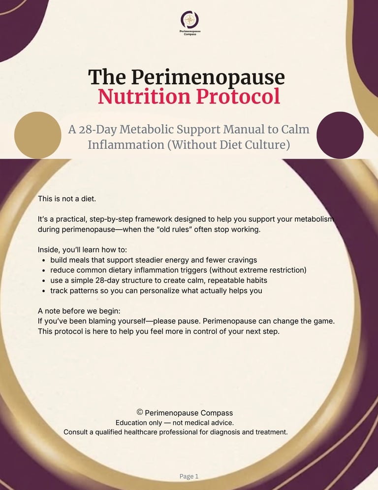 If what worked before isn’t working anymore, you’re not failing—perimenopause can change the rules. This protocol gives you a calm, practical structure to support steadier energy, calmer cravings, and a lower “inflammation load” over 28 days.